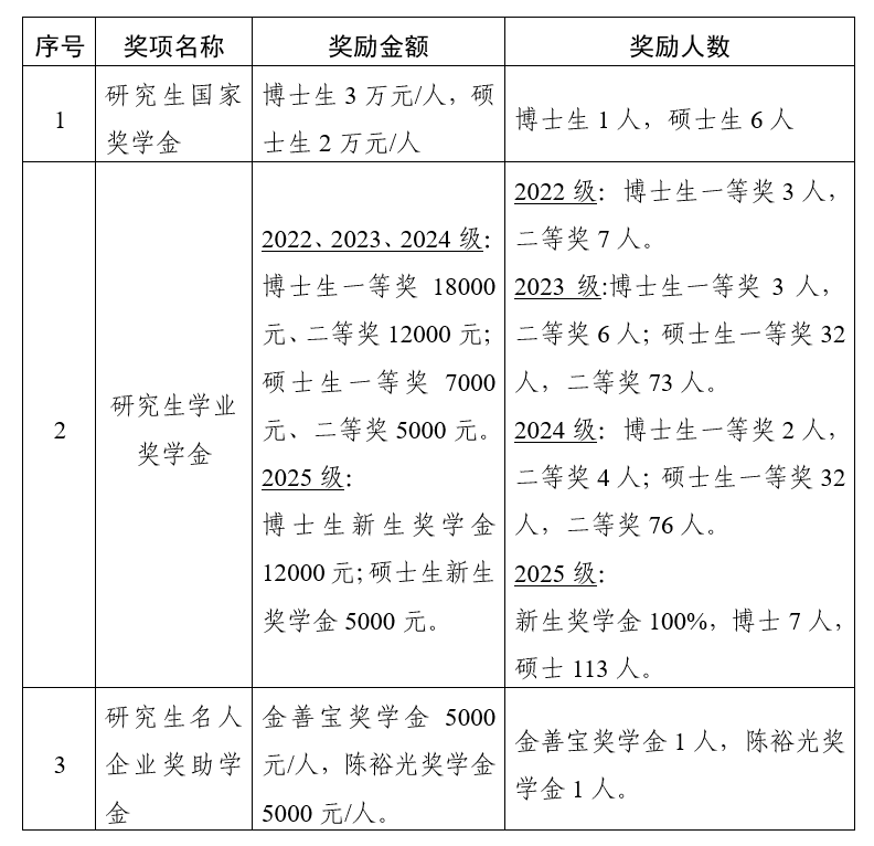 各类研究生评选奖项、金额、奖励人数见下表: