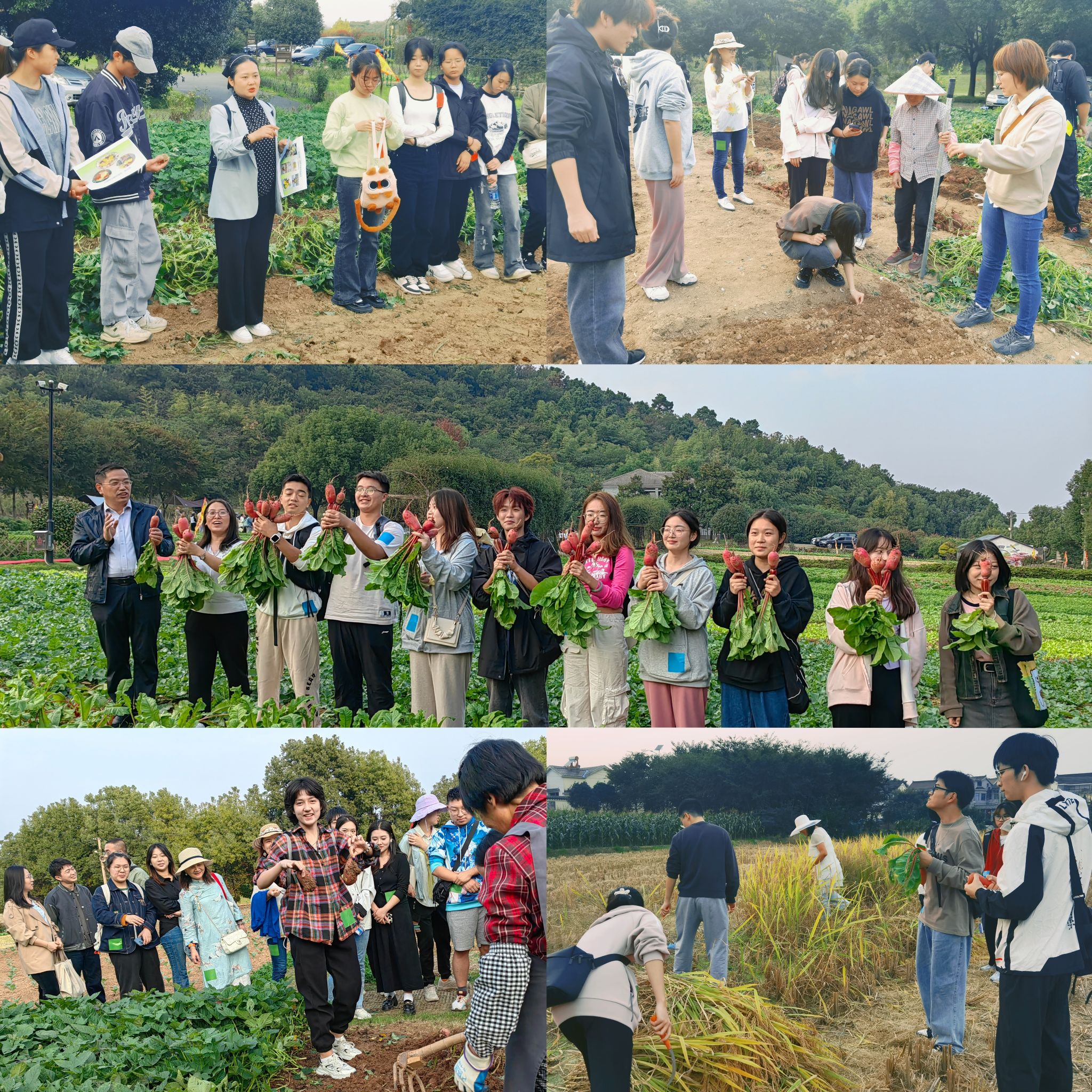 柳李旺教授、蒋芳玲教授、王燕副教授、周蓉副教授、虞夏清副教授等老师受聘研学导师兼农园技术顾问。近80位来自文化遗产、旅游管理和表演、生科等专业的研究生、本科生一起参与体验丰收盛会。