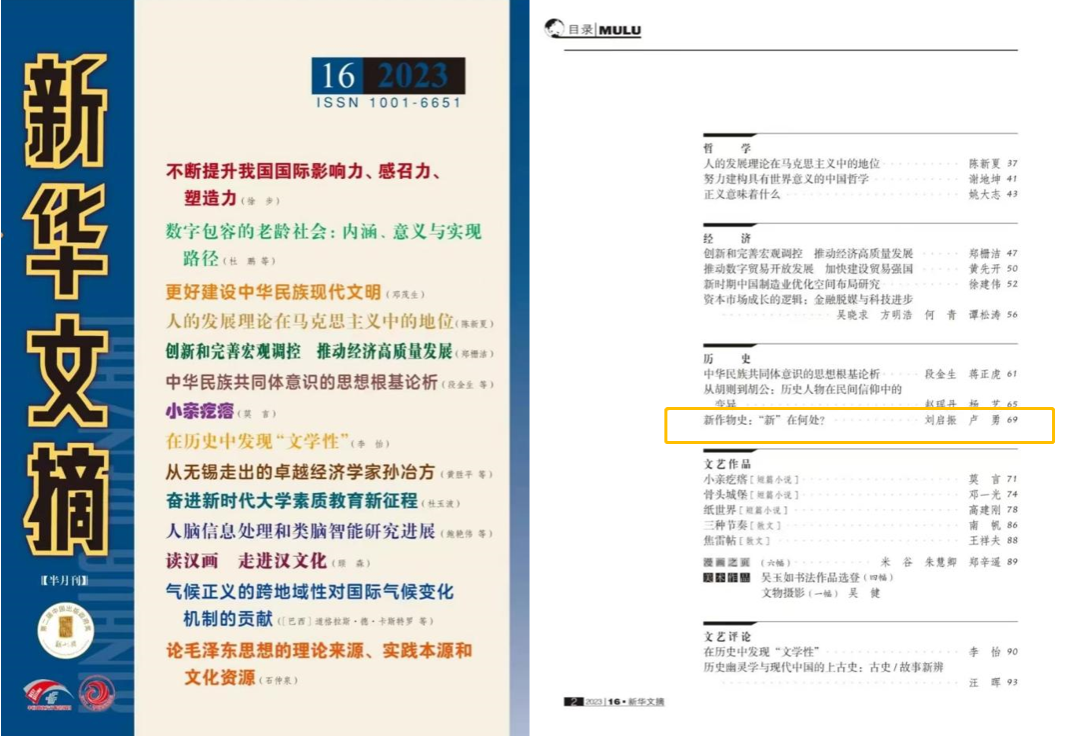 、中华农业文明研究院刘启振助理研究员、卢勇教授合作撰写的论文《新作物史:“新”在何处?》被《新华文摘》2023年第16期全文转载。