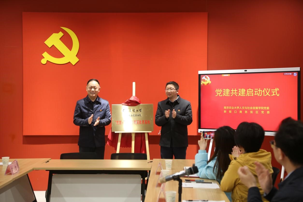 “党建+新街口商圈教育基地”揭牌。戚秋生和李日葵代表双方单位共同签署党建共建协议书。双方商定将在政治理论联学实践活动联办、推进产教融合协同创新发展、弘扬志愿精神聚力服务社会等方面加强交流互动。