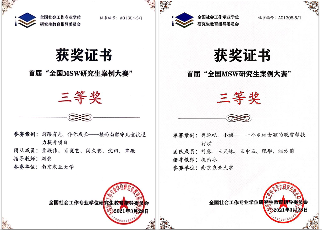 参赛队伍过关斩将,先后通过了三轮选拔。最终,由刘影老师指导、黄凝伟同学带队的《前路有光,伴你成长——桂西南留守儿童抗逆力提升项目》和由祝西冰老师指导、刘露同学带队的《奔跑吧,小梅——一个乡村女孩的教育帮扶行动》两项案例荣获三等奖,展现了南农社会工作专业研究生良好的精神风貌和扎实的实务技能。