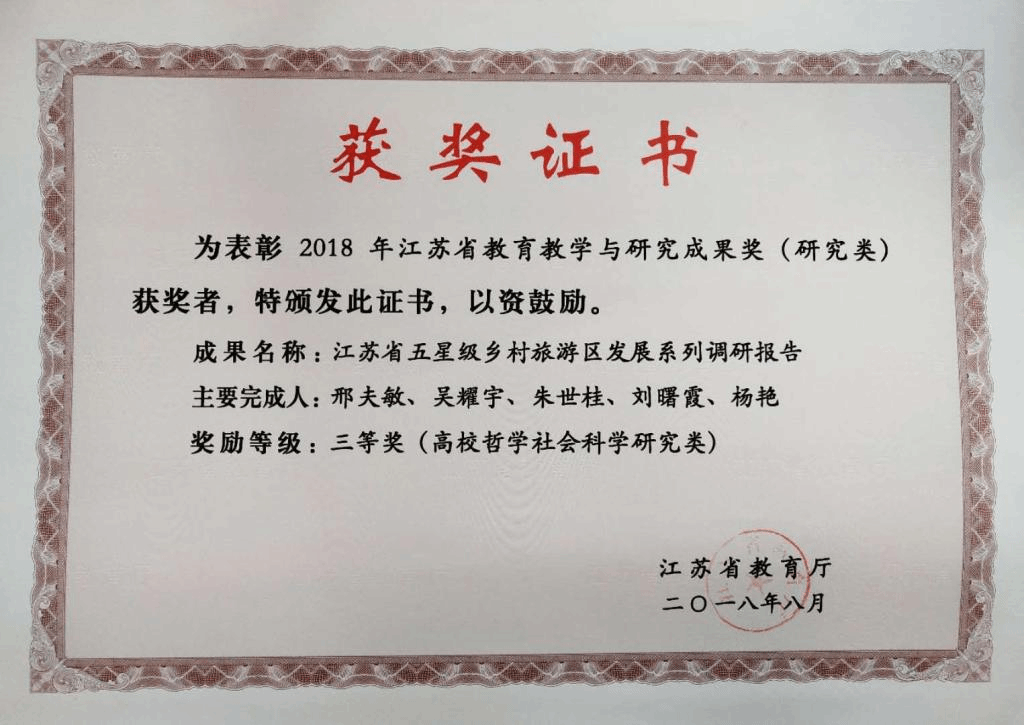 朱世桂教授参与的“江苏省五星级乡村旅游区发展系列调研报告”成果获江苏省教育科学研究成果奖(高校哲学社会科学研究类)三等奖。乡村旅游(Rural Tourism)是以乡村自然风光、乡村文化、乡村生产和乡村生活等为吸引物,满足游客观光、休闲、度假、体验、娱乐、求知等需求的旅游活动;江苏省乡村旅游从上世纪80年代起步以来,实现了从1.0的农家乐到乡村度假3.0的变迁,正在走向乡村旅居的4.0新时代。2016年江苏省全面展开了五星级乡村旅游区创建等工作,有力地推动了江苏省乡村旅游品牌化、特色化、集聚化发展,“江苏省五星级乡村旅游区发展系列调研报告”成果是由苏州科技大学牵头、成人短视频