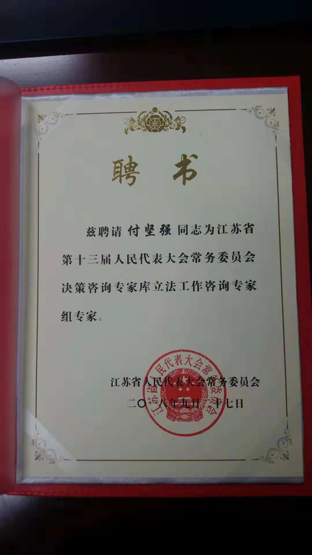 付坚强教授受聘担任江苏省人大常委会立法决策咨询专家。