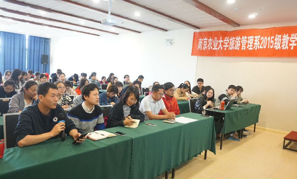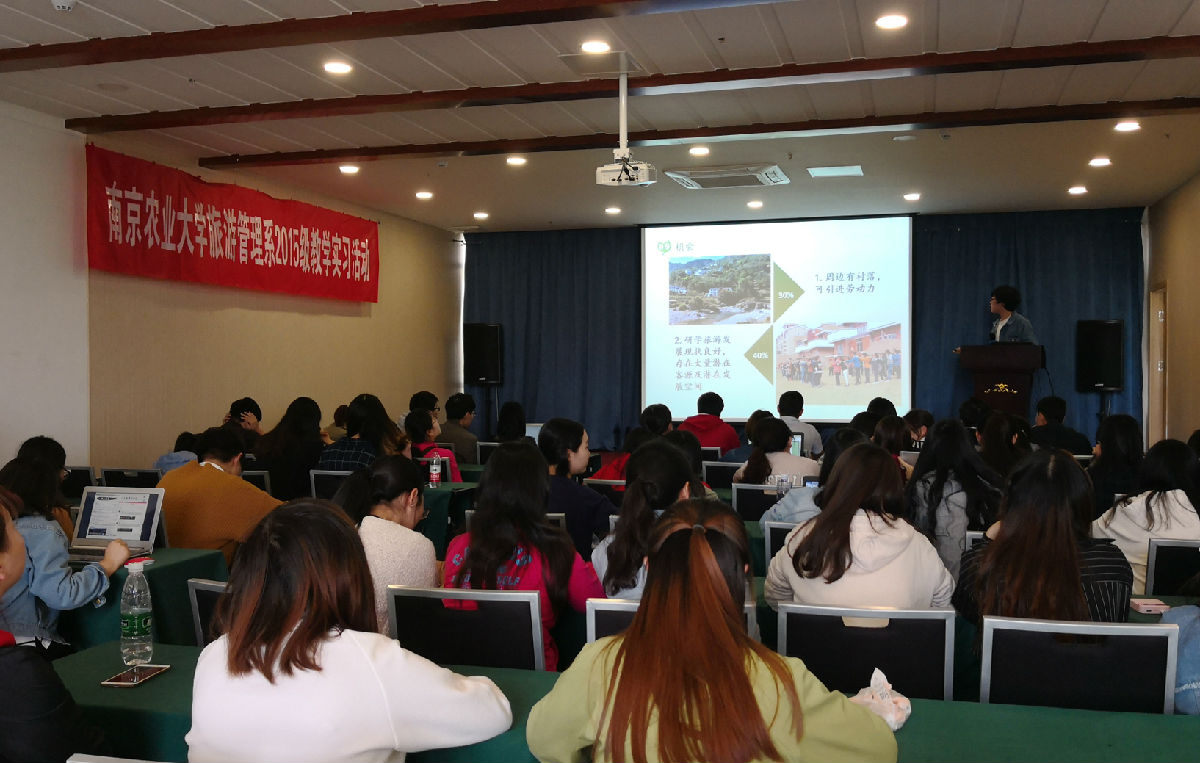 全体师生于下午5:40抵达溧阳天淼山庄,受到了天淼山庄副总经理蒋成(南农2015届毕业生)和营销副总陈总的热情接待,在顺利办理入住手续后为全体师生准备了丰盛特色的晚餐。晚上7:30,全体师生召开实习课题任务布置会。黄颖老师与陈总共同揭开“成人短视频