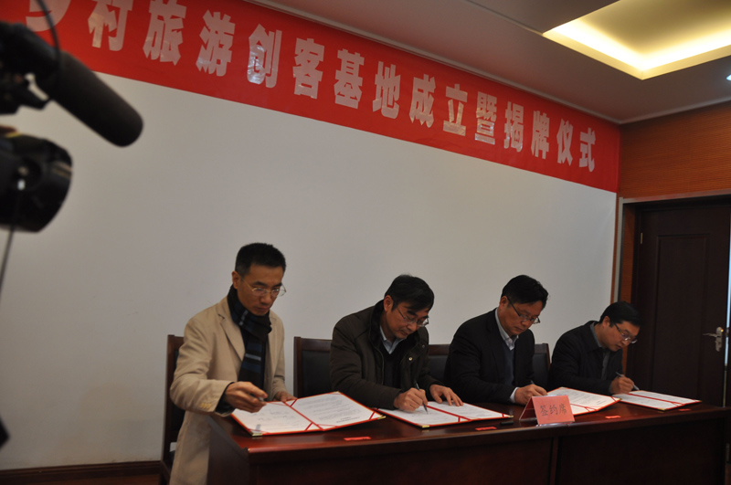 杨旺生院长、上海艾谷农业科技有限公司戎华执行董事、潘黄街道徐启楼主任共同签署了“江苏省乡村旅游创客示范基地共建协议书”,盐城市人民政府张京麒副市长和南农大杨旺生院长为“江苏省乡村旅游创客示范基地”揭牌。