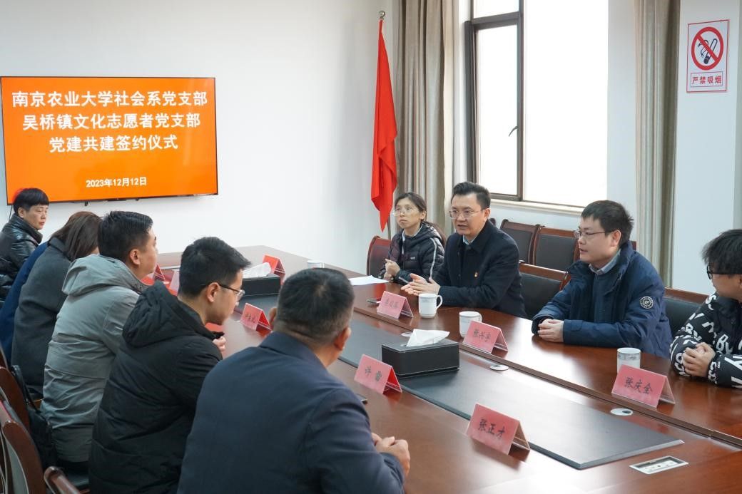 向吴桥镇赠送了由社会学系编写的《农村社会调查文集—扬州市江都区吴桥镇特辑》。随后,杨灿君、张正才分别代表双方党支部签署结对共建协议书。