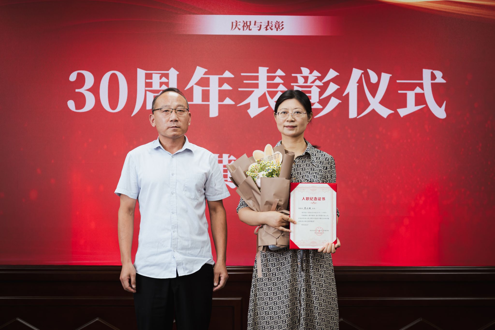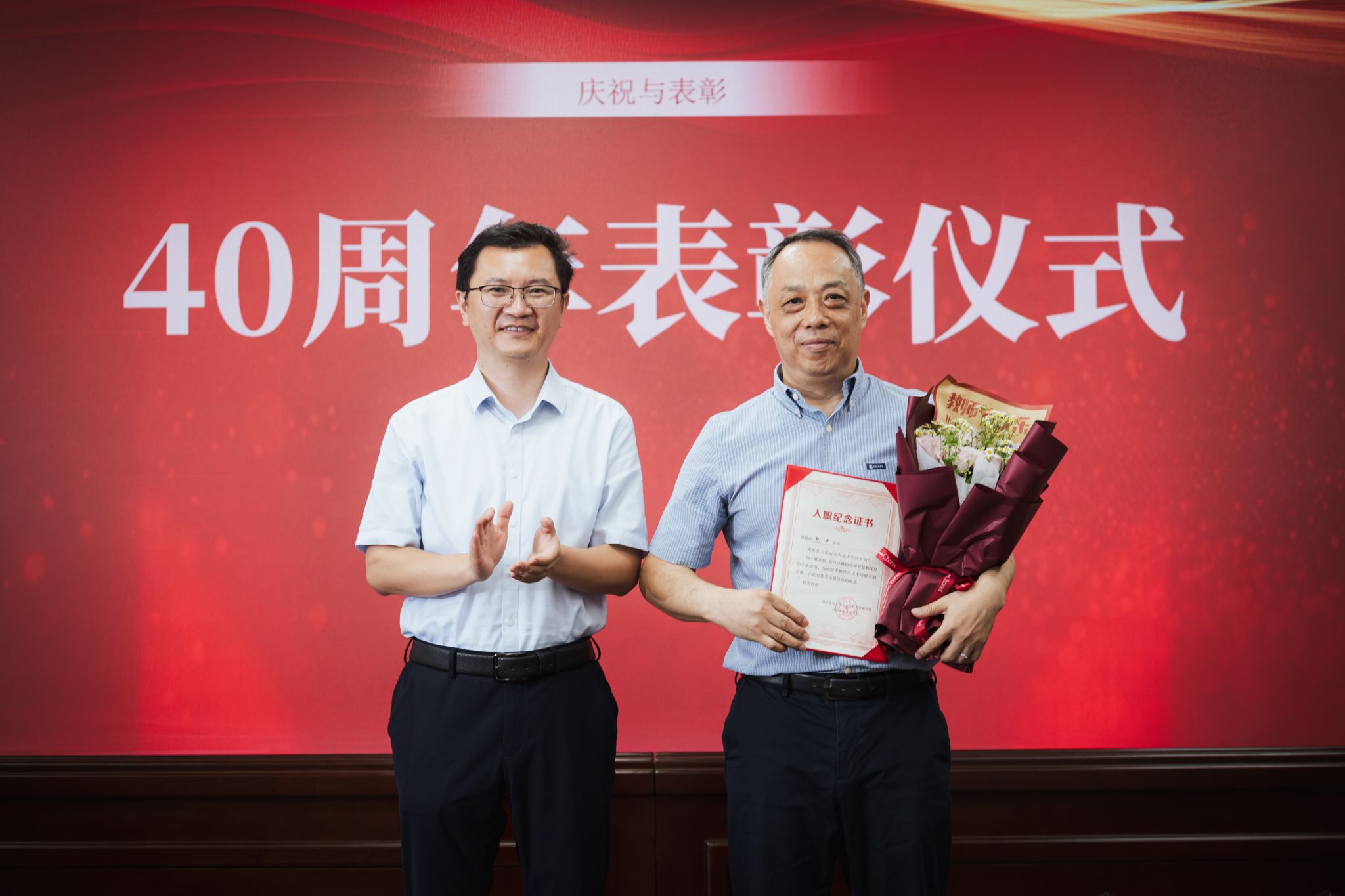 领导李日葵书记、桑运川副书记、朱利群副院长和戚晓明副院长,分别为入职满40、30、20、10周年的教职员工颁发了证书和鲜花,以表彰他们多年来为成人短视频