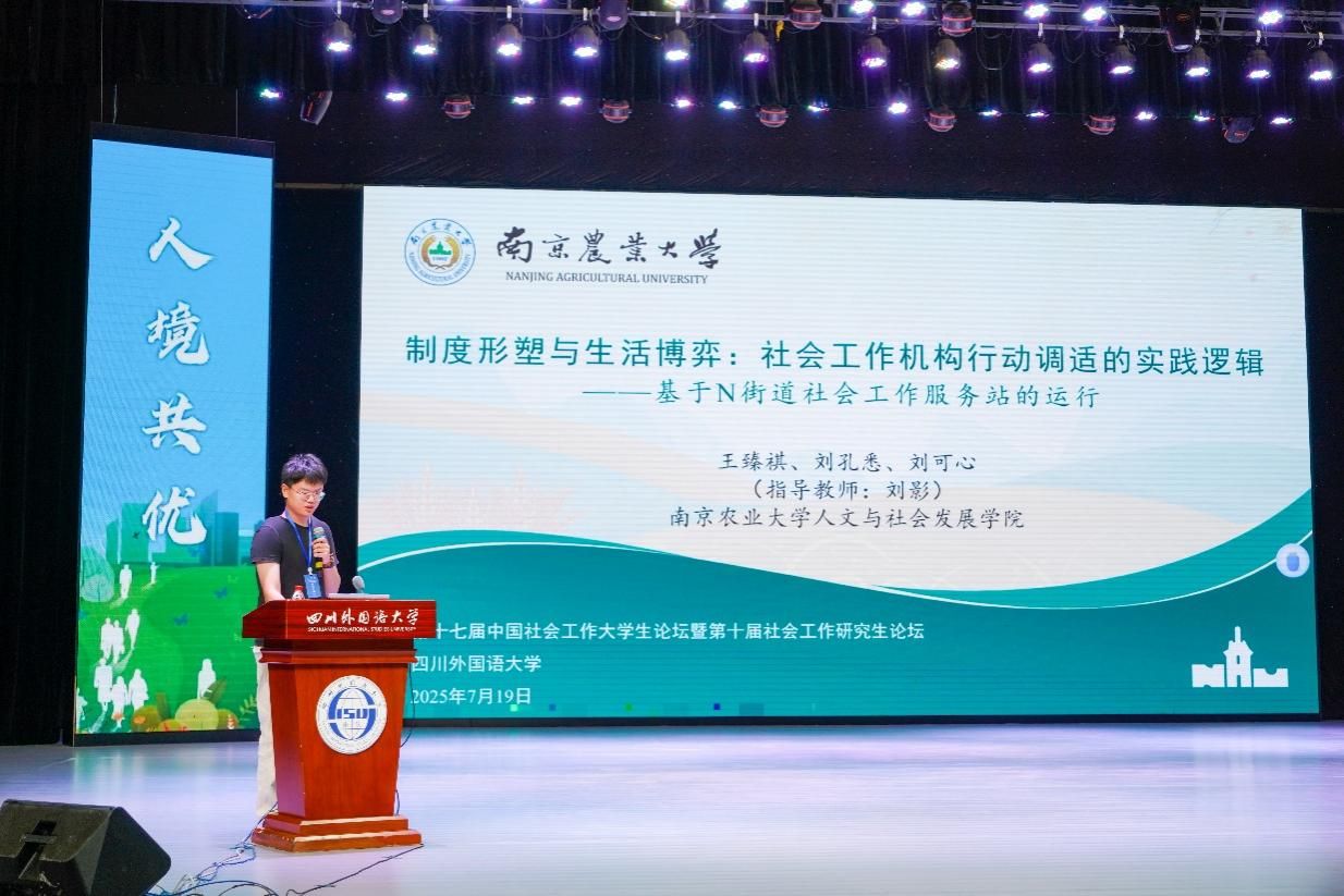 2025年7月18日至7月20日,由中国社会工作教育协会主办,四川外国语大学承办的“第十七届中国社会工作大学生论坛暨第十届社会工作研究生论坛”在重庆市四川外国语大学召开。本届论坛主题为“中国式现代化与社会工作创新发展”,共收到来自全国社会工作专业学生的投稿835篇,经初筛与专家盲审,最终443篇论文入选。我院刘影副教授指导,2024级社会工作专业硕士研究生王臻祺、刘孔悉与2023级社会工作专业硕士研究生刘可心合著的论文入选主论坛,并受邀作大会发言。