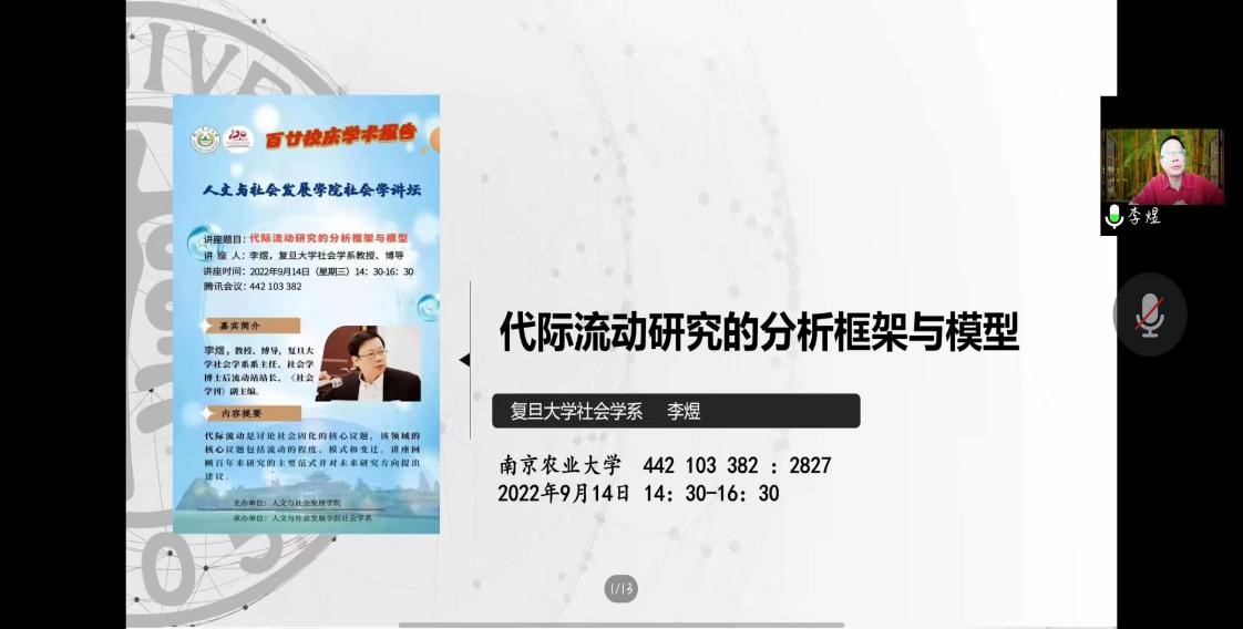 社会学讲坛在腾讯会议举办。复旦大学社会学系主任李煜教授应邀做了题为“代际流动研究的分析框架与模型”的学术讲座。本次讲坛由社会学系主任戚晓明教授主持,旅游管理系主任崔峰教授、社会学系阎莉教授、社会学系王小璐副教授、张爱华副教授、祝西冰副教授、杨灿君副教授、张兴宇副教授、张娜副教授、刘影老师、周阳老师、朱慧劼老师、刘春卉老师以及社会学系的本科生、研究生共计100多人参加了本次讲坛。