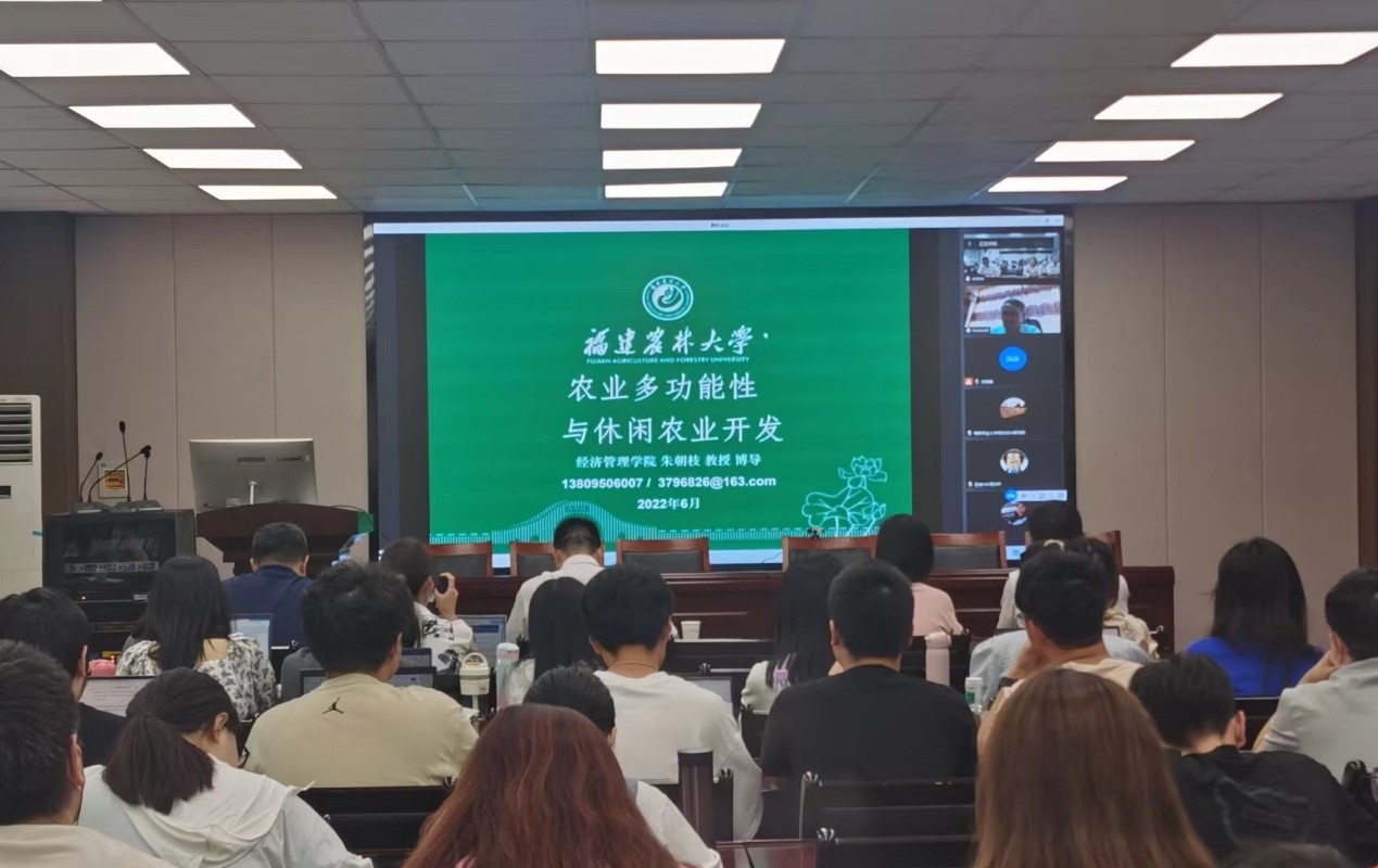 上半场报告会由朱朝枝教授主讲。朱朝枝教授主要围绕农业多功能性、休闲农业开发的资源分析、休闲农业的开发策略三部分内容展开。他首先向在座师生阐述了农业多功能性的概念、提出的背景及其内容,进而引出农业的观光休闲功能,并对休闲农业的开发展开了具体的介绍。朱朝枝教授认为,休闲农业产业的本质是有利于自身发展的相对自由的生活状态,是自然再生产与社会再生产相互交融的特殊产业,要重视休闲农业产业的发展。接着,他针对休闲农业的五大资源基础即自然资源、景观资源、产业资源、文化资源、人的资源展开了详细介绍,并采用了丰富的案例向在座师生呈现了休闲农业的各类活动设计。最后,朱朝枝教授表示,要全力推动休闲农业高质量发展,积极推进乡村全面振兴,并提出了休闲农业的五大开发策略及具体实施方案。