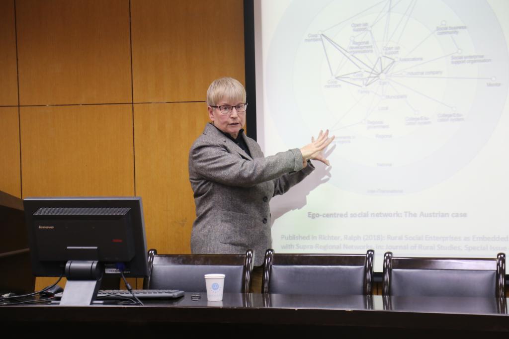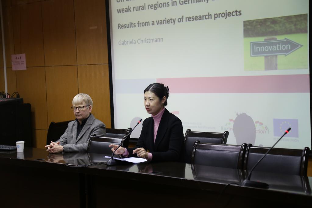本次讲座主要报告了加布里埃拉教授进行的五个研究项目的主要结果,并探讨如何在弱结构农村地区开发创造性的方法以解决当地问题。讲座围绕“社会创新”展开。德国弱结构农村地区的特征是发展前景消极,例如结构性赤字,经济生产率低于平均水平,职业前景不理想,基础设施不足,人口迁出和负面言论等。尽管存在这些不利条件,并且基本上这些地区是倾向保持现状而非改变的,是由传统的、志同道合的群体所组成的,但根据研究结果,教授指出农村地区的一些参与者还是开始为解决现有问题和解决方案寻求创新,以创新的解决方案来改善他们的生活条件。这些研究项目(其中两个由欧盟资助)的重点在于社会创新解决方案如何开始、如何实施以及如何在农村地区进行空间传播。研究人员询问了社会创新的参与者是谁,他们如何合作,在哪些过程中创造了新颖性和促进社会创新的必要条件。报告还重点介绍了“社区企业”和“智能乡村”等热点研究现状。