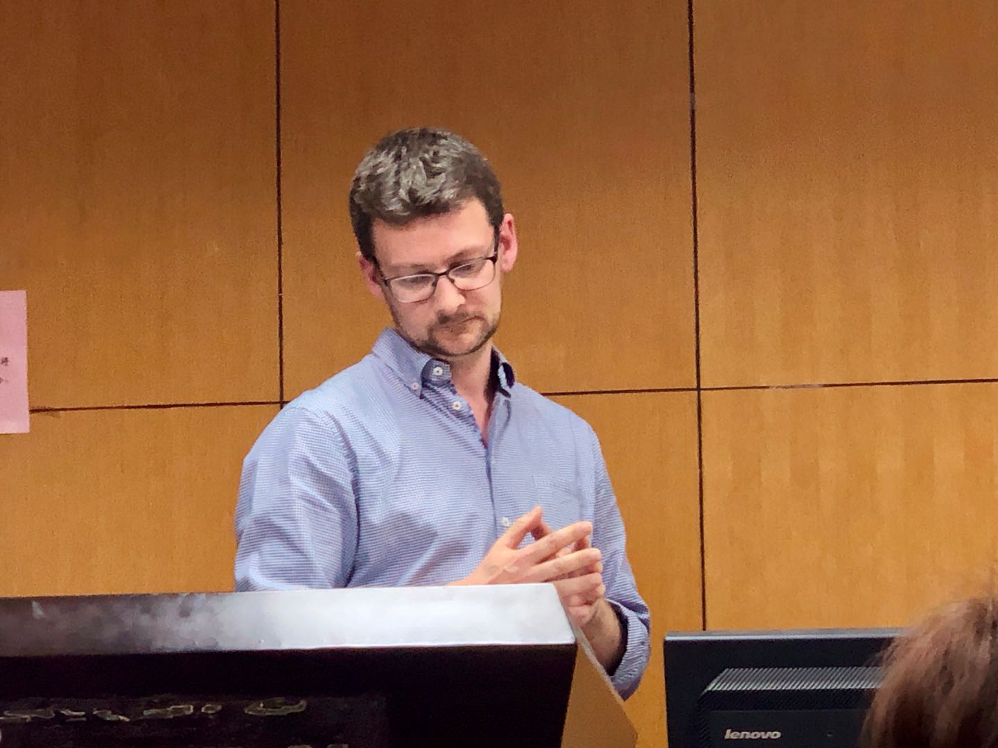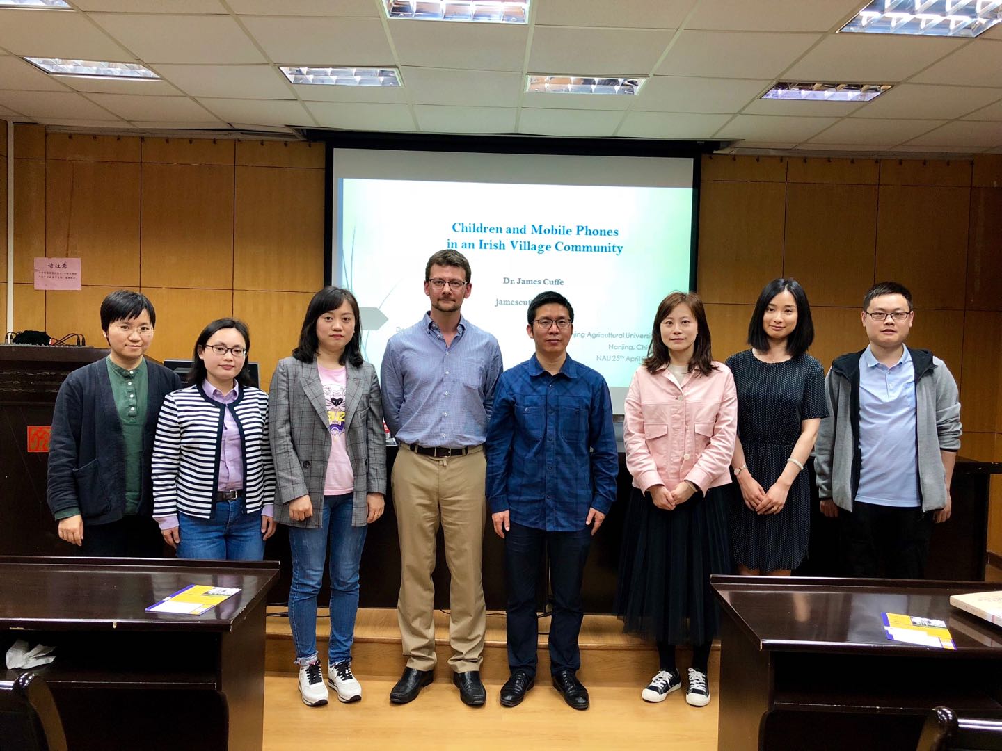 社会学系主任戚晓明主持,特邀南京大学人类学助理研究员冉光沛现场翻译,来自爱尔兰国立科克大学社会学与犯罪学系的青年人类学者James Cuffe 博士发表了题为“Children and Moblie Phones in Irish Village Community”的精彩讲座。江苏省民间文艺家协会副主席张丹、成人短视频