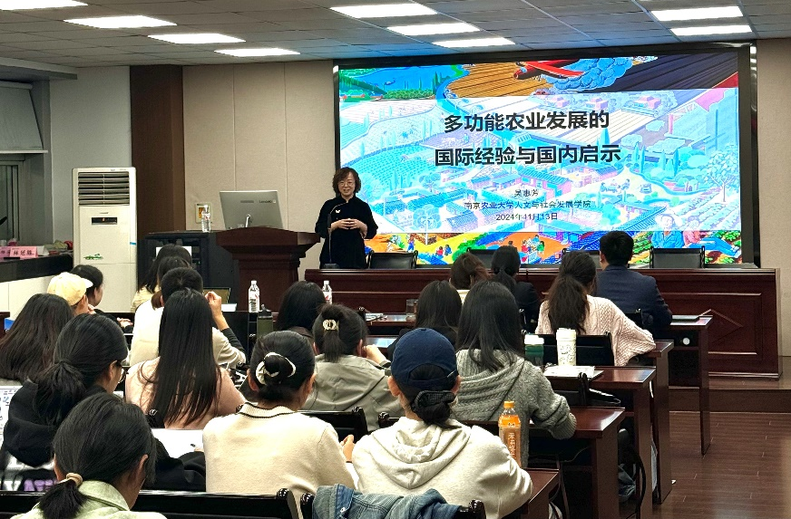 农业社会学团队所做的相关研究;为大家讲述了多功能农业出现的背景,并紧密结合自身“FAO课题”研究经验及对荷兰“亲近动物有机农场”及“集康养、农场点、休闲、教育为一体的农村”等调研经验,从农业基础设施、多功能性、生产者与消费者间关系等方面总结了欧洲多功能农业的发展现状。随后,吴惠芳教授向在场师生详细介绍了荷兰地区合作社的杰出案例——北弗省合作社。她介绍了北弗省合作社注重制度化的交流与合作、维护改善自然景观的现状和北弗省合作社的十条共享价值道义经济,并结合该案例总结出地方合作社的特征。最后,她从政策话语和社会学学术话语出发,结合当下我国农业发展案例及发展实际,提出“多大(小)是小农?”“小农可否现代化?”“生机需求与农业效益如何兼顾?”等问题,呼吁与会师生积极思索“中国农业的未来是什么”,并对中国未来多功能农业发展做出展望。