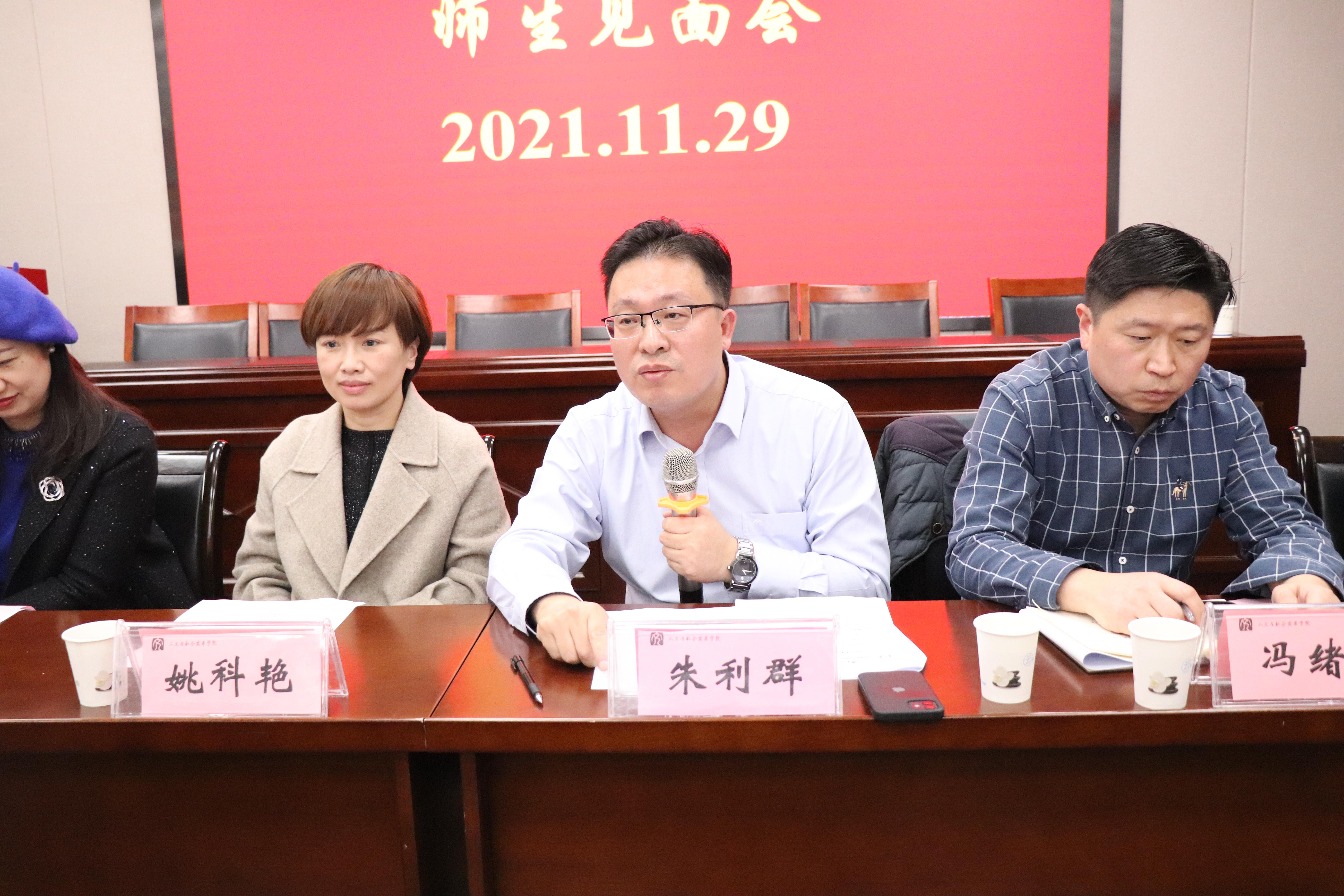 学科点点长朱利群主要就学科研究方向、师资力量以及培养方案等方面进行了详细介绍。他指出,近年来学科点研究方向不断调整优化、培养方案不断改革完善、师资力量不断壮大、生源质量不断提升,彰显了学科点近年来的建设成效,充分表明了学科整体实力正稳步提升,他建议各位新生充分利用学科特色与优势,牢牢把握机遇,不断提升自我。同时,朱利群也对在座新生提出了四点期望:一要与人为善,诚信做人;二要孝敬父母,尊敬师长;三要目标高远,脚踏实地;四要树立理想,勤奋学习。最后他寄语新生:希望各位同学通过未来两年的研究生学习生活,能够学有所成、身体健康、一切如意!